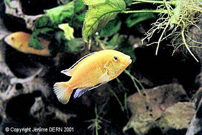 Famille : Cichlidés. Habitat : Endémique du Lac Malawi et plus précisément de Nkhata Bay. Description : De couleur jaune vif (ou jaune bouton d'or), il en existe également de couleur bleu pâle cobalt (plus rare à trouver dans le commerce). Les nageoires pelviennes, dorsale et anales sont noires. Taille : Sa taille adulte va de 8 cm (dans la nature) à 15 cm (en aquarium). Différences Sexuelles : Il est impossible de différentier, avec certitude, les mâles des femelles. Les mâles sont en général plus territoriaux et dominateurs que les femelles mais ce n'est pas une règle générale. Il semble également que le mâle soit plus coloré que la femelle lors de la parade amoureuse et que les femelles aient des bandes noires plus fines sur leurs dorsales. Certains mâles ont des petites tâches oranges sur la nageoire anale et certaines femelles ont de discrètes rayures sombres et verticales sur le corps. Température : 23 à 28°C (26°C est l'optimum) pH : Eau alcaline pH entre 7,5 et 8,5 (8.2 est l'optimum) Éclairement : Prévoir environ 1 Watt pour 3 litres d'eau... Sol : Du sable fin de préférence car ils aiment fouiller dans le sol. Décor : Rocheux avec des grottes et cachettes. On retrouve cette espèce dans les fonds rocheux ainsi que dans les endroits herbeux où poussent les Vallisneria Aethiopica. Il n'y a pas beaucoup de plantes dans leur milieu naturel, mais cela ne pose pas de problème si le bac est planté (mousse de Java, Vallisneria...). Nourriture : Dans la nature, les labidochromis se nourrissent dans la couverture d'algues appelée Aufwuchs. Ils ne mangent pas vraiment les algues mais plutôt les invertébrés, les crustacés, les larves d'insectes ou les vers qui s'y cachent. En aquarium, le labidochromis mangera principalement des insectes, mais également paillettes, granulée, artémias, crevettes cuites, nourriture congelée diverse ainsi que des algues, épinards et laitue (dont ils sont friands)... Il est important de varier la nourriture de cet animal et qu'elle comporte une part végétale. En aquarium, comme dans la nature, vous remarquerez sa façon de s'alimenter : Il s'immobilise au-dessus d'un rocher, le corps penché en avant, cherche sa proie des yeux et soudain fonce sur elle.