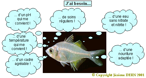 Il est également à noter que certains poissons qui vivent dans les estuaires nécessitent une eau saumâtre (légèrement salée) qui n'est pas forcément appréciée par les autres poissons : il convient donc de mettre ces poissons qu'avec des poissons de même exigence. Dernière mise à jour : 26 Décembre 2004 |