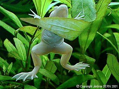 Les têtards de Xenopus sont végétariens et doivent être nourris avec une pâtée constituée de laitue, épinards, cresson bouillis à laquelle on peut ajouter de la spiruline, des infusoires ou des paillettes pour poissons broyées. Quatre jours plus tard l'alimentation pourra doucement évoluer vers de larves broyées. Les têtards de Hymenochirus sont carnivores on devra les nourrir avec du fin plancton de marre et des infusoires. Au bout de deux à trois mois environ, les têtards sont devenus de minuscules grenouilles de 2 centimètres. Leur maturité sexuelle ne sera atteinte qu'au bout d'un an environ. Pour l'anecdote, il existe des kits de reproduction artificiellement assistée pour ces grenouilles qui consistent en des injections d'hormones supposées déclencher une ponte. Evidemment ces méthodes sont horribles et condamnables. Il est si intéressant d'observer leur comportement naturel lors de la reproduction... Conclusion Ces grenouilles sont idéales pour reconstituer un biotope africain de type cours d'eau. En revanche, elles imposent des conditions de maintenance assez strictes et délicates. On pourra citer les contraintes de nourriture (nourriture vivante conseillée, surgelée à défaut, pas de paillette ou granulé), d'habitat (galerie grillagée), de maintenance (température) et de cohabitation (taille, vivacité et agressivité des poissons associés). La conclusion de cet article est que ces animaux, même s'ils apportent une touche d'originalité dans l'aquarium, sont à réserver à des aquariophiles expérimentés et passionnés qui s'intéressent à reconstituer un biotope. Toutefois, la grande disponibilité de ces animaux en animalerie, comme celle de poissons délicats comme les poissons-éléphants (avec lesquelles ces grenouilles se marient bien d'ailleurs), tend à prouver l'existence d'une importante clientèle (mal informée et inconsciente) pour ces adorables amphibiens... C'est bien regrettable car nous savons qu'un grand nombre d'entre eux ne survivra pas longtemps. Dernière mise à jour : 9 Août 2001 |