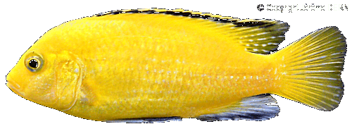 Famille : Cichlidés. Habitat : Endémique du Lac Malawi et plus précisément de Nkhata Bay. Description : De couleur jaune vif (ou jaune bouton d'or), il en existe également de couleur bleu pâle cobalt (plus rare à trouver dans le commerce). Les nageoires pelviennes, dorsale et anales sont noires. Taille : Sa taille adulte va de 8 cm (dans la nature) à 15 cm (en aquarium). Différences Sexuelles : Il est impossible de différentier, avec certitude, les mâles des femelles. Les mâles sont en général plus territoriaux et dominateurs que les femelles mais ce n'est pas une règle générale. Il semble également que le mâle soit plus coloré que la femelle lors de la parade amoureuse et que les femelles aient des bandes noires plus fines sur leurs dorsales. Certains mâles ont des petites tâches oranges sur la nageoire anale et certaines femelles ont de discrètes rayures sombres et verticales sur le corps. Température : 23 à 28°C (26°C est l'optimum) pH : Eau alcaline pH entre 7,5 et 8,5 (8.2 est l'optimum) Éclairement : Prévoir environ 1 Watt pour 3 litres d'eau... Sol : Du sable fin de préférence car ils aiment fouiller dans le sol. Décor : Rocheux avec des grottes et cachettes. On retrouve cette espèce dans les fonds rocheux ainsi que dans les endroits herbeux où poussent les Vallisneria Aethiopica. Il n'y a pas beaucoup de plantes dans leur milieu naturel, mais cela ne pose pas de problème si le bac est planté (mousse de Java, Vallisneria...). Nourriture : Dans la nature, les labidochromis se nourrissent dans la couverture d'algues appelée Aufwuchs. Ils ne mangent pas vraiment les algues mais plutôt les invertébrés, les crustacés, les larves d'insectes ou les vers qui s'y cachent. En aquarium, le labidochromis mangera principalement des insectes, mais également paillettes, granulée, artémias, crevettes cuites, nourriture congelée diverse ainsi que des algues, épinards et laitue (dont ils sont friands)... Il est important de varier la nourriture de cet animal et qu'elle comporte une part végétale. En aquarium, comme dans la nature, vous remarquerez sa façon de s'alimenter : Il s'immobilise au-dessus d'un rocher, le corps penché en avant, cherche sa proie des yeux et soudain fonce sur elle.